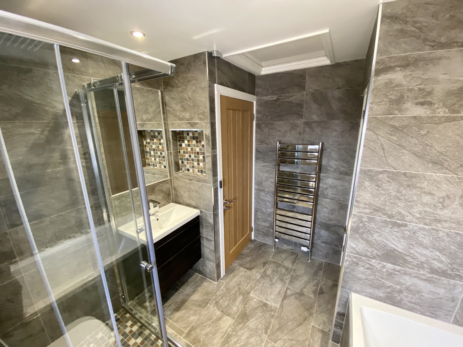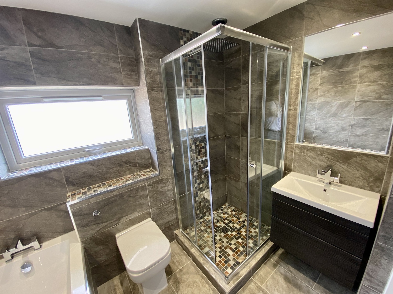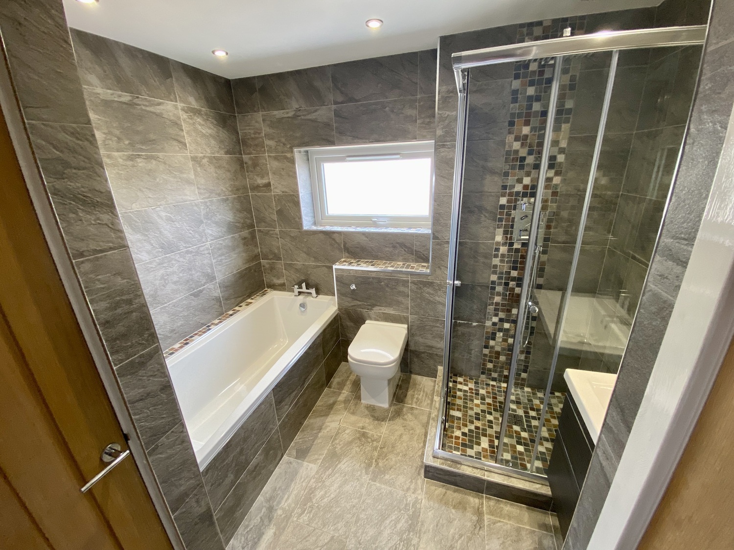Upstairs are three large double bedrooms, all with grey carpets, the master having fitted wardrobes. A spacious fully tiled bathroom comprising of bath, basin, WC and a separate shower.