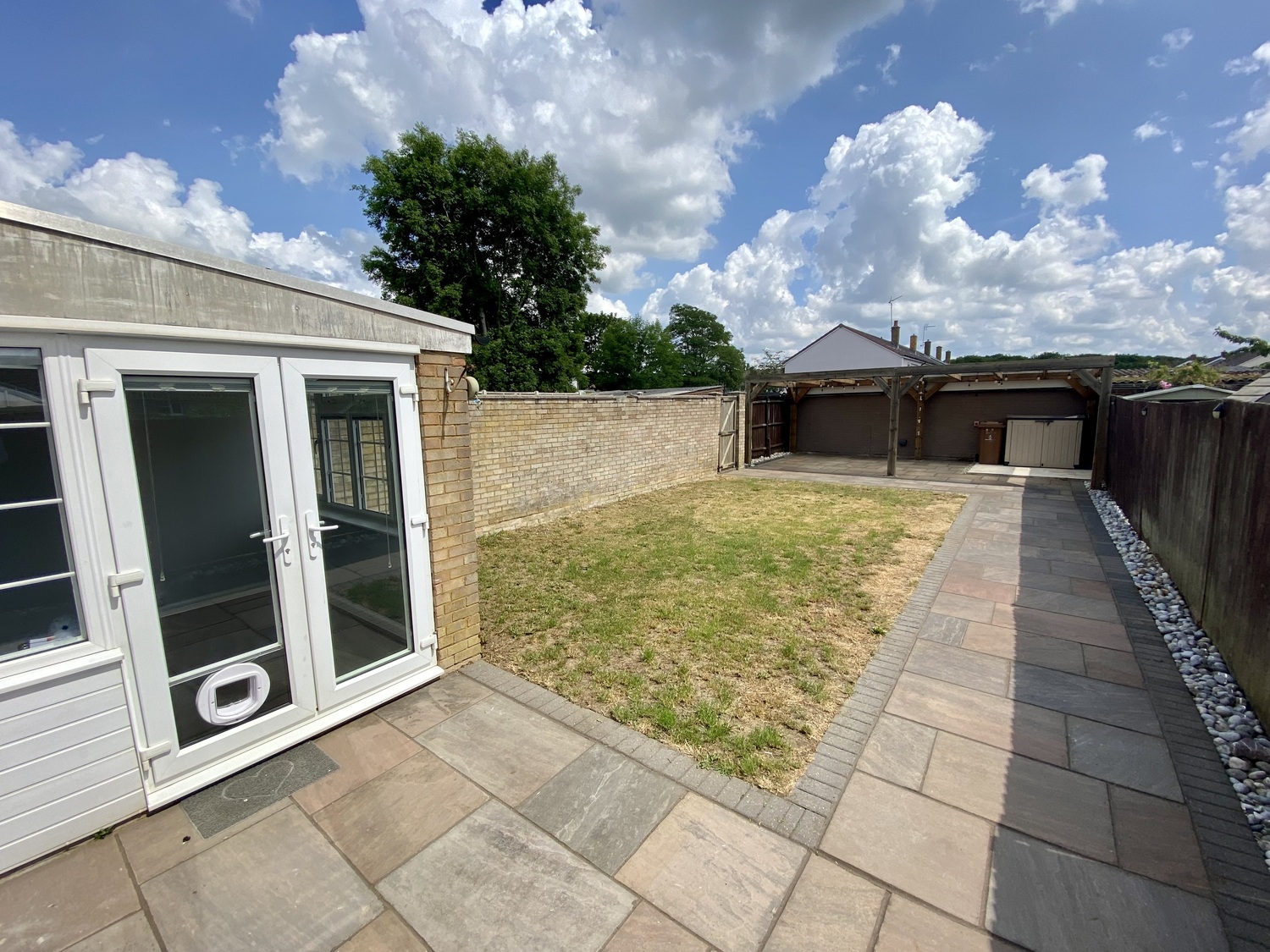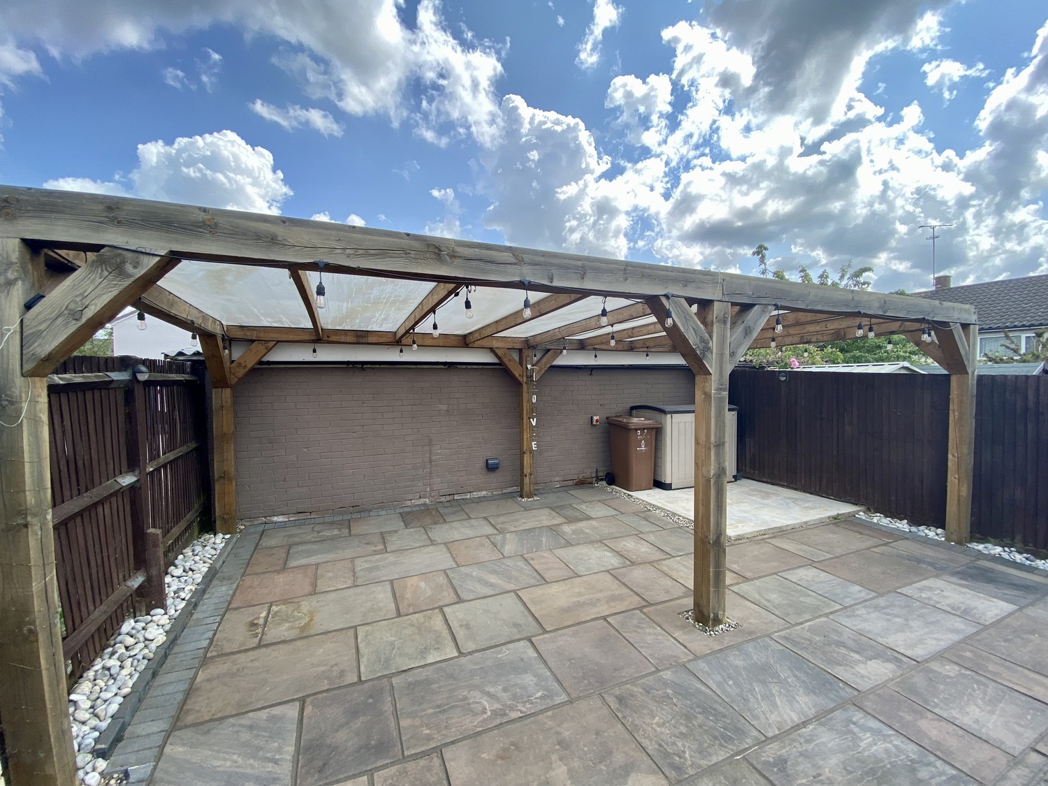 The rear garden is laid to lawn with a paved covered patio entertainment area at the back and further paved pathways. There is a driveway with ample parking for 2 cars to the front.